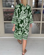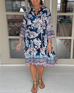 SPECIFIKATIONER Stil: Afslappet Materiale: Bomuldsblanding Kjoletype: A-linje Kjolelængde: Maxi Halsudskæring: V-udskæring Mønstertype: Tryk Ærmetype: Drop Shoulder Ærmelængde: Trekvartærmet Detaljer: Knapper Pasform: Almindelig Sæson/årstid: Forår,Sommer Lejlighed: Daglig Pakken inkluderer: 1 x Kjole STØRRELSESTABEL (cm) Størrelse Buste Læn...