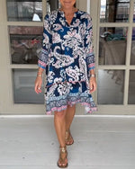 SPECIFIKATIONER Stil: Afslappet Materiale: Bomuldsblanding Kjoletype: Shift-kjole Kjolelængde: Knælængde Halsudskæring: V-udskæring Mønstertype: Tryk Ærmetype: Almindeligt ærme Ærmelængde: Trekvartærmet Detaljer: Knapper,Rynket Pasform: Almindelig Sæson/årstid: Forår,Sommer Lejlighed: Daglig Pakken inkluderer: 1 x Kjole STØRRELSESTABEL (cm) ...