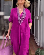 SPECIFIKATIONER Stil: Afslappet Materiale: Bomuldsblanding Kjoletype: A-linje Kjolelængde: Maxi Halsudskæring: V-udskæring Mønstertype: Ensfarvet Ærmelængde: Halve ærmer Detaljer: Lomme Pasform: Almindelig Sæson/årstid: Forår,Sommer,Efterår Lejlighed: Daglig Pakken inkluderer: 1 x Kjole STØRRELSESTABEL (cm) Størrelse Buste Længde S 97 132 ...