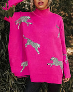 Stilfuld løs højhalset pullover med delvist leopardprint