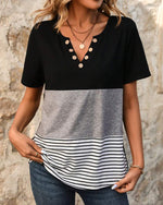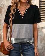 SPECIFIKATIONER Top type: T-shirt Stil: Afslappet Materiale: Bomuldsblanding Lejlighed: Daglig Halsudskæring: V-udskæring Mønstertype: Stribet,Farveblok Ærmelængde: Kortærmet Pasform: Almindelig Sæson/årstid: Forår,Sommer Pakken inkluderer: 1 x T-shirt STØRRELSESTABEL (cm) Størrelse Buste Længde S 97 65 M 101 66.5 L 105 68 XL 111 69....
