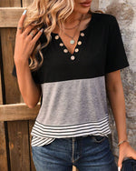 SPECIFIKATIONER Top type: T-shirt Stil: Afslappet Materiale: Bomuldsblanding Lejlighed: Daglig Halsudskæring: Rund hals Mønstertype: Stribet,Farveblok Ærmetype: Almindeligt ærme Ærmelængde: Kortærmet Pasform: Almindelig Sæson/årstid: Forår,Sommer Detaljer: Knapper Pakken inkluderer: 1 x T-shirt STØRRELSESTABEL (cm) Størrelse Buste Længde S...