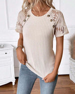 SPECIFIKATIONER Top type: T-shirt Stil: Afslappet Materiale: Bomuldsblanding Lejlighed: Daglig Halsudskæring: V-udskæring Mønstertype: Ensfarvet Ærmetype: Almindeligt ærme Ærmelængde: Kortærmet Pasform: Almindelig Sæson/årstid: Forår,Sommer,Efterår Detaljer: Patchwork,Knapper,Snøre Pakken inkluderer: 1 x T-shirt STØRRELSESTABEL (cm) Størrels...