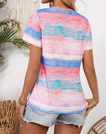 SPECIFIKATIONER Top type: T-shirt Stil: Afslappet Materiale: Bomuldsblanding Lejlighed: Daglig Halsudskæring: V-udskæring Mønstertype: Stribet Ærmetype: Almindeligt ærme Ærmelængde: Kortærmet Pasform: Almindelig Sæson/årstid: Forår,Sommer Pakken inkluderer: 1 x T-shirt STØRRELSESTABEL (cm) Størrelse Buste Længde S 97 68 M 101 69.5 L 10...