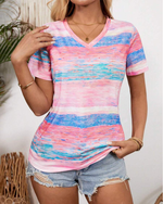 SPECIFIKATIONER Top type: T-shirt Stil: Afslappet Materiale: Bomuldsblanding Lejlighed: Daglig Halsudskæring: V-udskæring Mønstertype: Stribet,Tryk Ærmetype: Almindeligt ærme Ærmelængde: Kortærmet Pasform: Almindelig Sæson/årstid: Forår,Sommer Pakken inkluderer: 1 x T-shirt STØRRELSESTABEL (cm) Størrelse Buste Længde S 97 65 M 101 66.5 ...