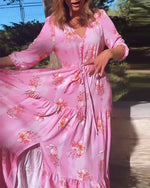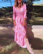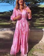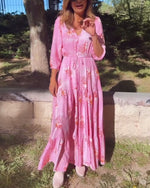 SPECIFIKATIONER Stil: Afslappet Materiale: Bomuldsblanding Kjoletype: A-linje Kjolelængde: Maxi Halsudskæring: V-udskæring Mønstertype: Tryk Ærmetype: Drop Shoulder Ærmelængde: Trekvartærmet Detaljer: Knapper Pasform: Almindelig Sæson/årstid: Forår,Sommer Lejlighed: Daglig Pakken inkluderer: 1 x Kjole STØRRELSESTABEL (cm) Størrelse Buste Læn...