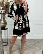 SPECIFIKATIONER Stil: Afslappet Materiale: Bomuldsblanding Kjoletype: Shift-kjole Kjolelængde: Maxi Halsudskæring: V-udskæring Mønstertype: Tryk Ærmetype: Almindeligt ærme Ærmelængde: Langærmet Detaljer: Patchwork Pasform: Almindelig Sæson/årstid: Forår,Efterår Lejlighed: Daglig Pakken inkluderer: 1 x Kjole STØRRELSESTABEL (cm) Størrelse Bus...
