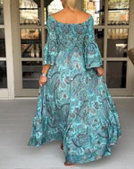 SPECIFIKATIONER Stil: Ferie Materiale: Bomuldsblanding Kjoletype: A-linje Kjolelængde: Maxi Halsudskæring: Off-shoulder Mønstertype: Tryk Ærmetype: Almindeligt ærme Ærmelængde: Kortærmet Pasform: Almindelig Sæson/årstid: Forår,Sommer Lejlighed: Daglig Pakken inkluderer: 1 x Kjole STØRRELSESTABEL (cm) Størrelse Buste Længde S 97 130 M 101...